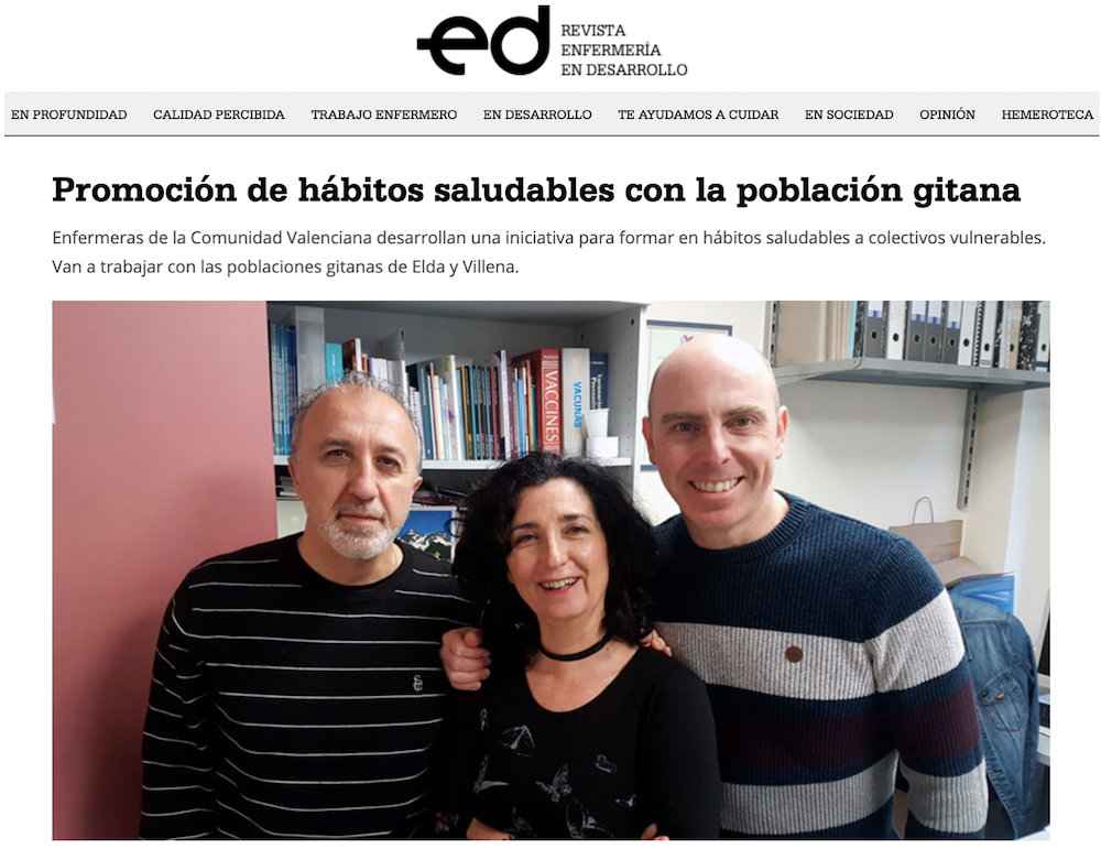 Las socias/os de la Asociación de Enfermería Comunitaria (AEC), Lola Gil Estevan, enfermera adjunta de la Dirección de Atención Primaria, Alejandro Cremades Bernabéu y Alfonso Jiménez López, ambos enfermeros de Salud Pública; desarrollan en el municipio de Elda (Alicante) el Proyecto Ipage, enmarcado en la Estrategia Valenciana para la Igualdad y la Inclusión del Pueblo Gitano 2018-2023, con la colaboración de la Federación Autonómica de Asociaciones Gitanas de la Comunidad Valenciana (FAGA).