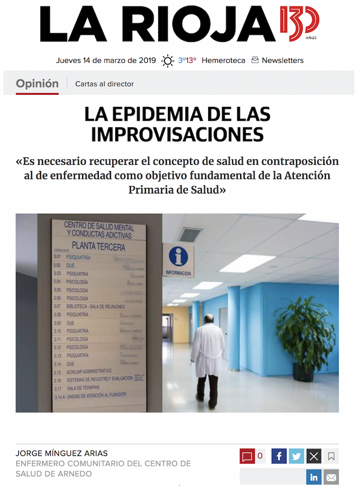 Interesante artículo de opinión sobre la actual crisis de la Atención Primaria de Salud (APS) de nuestro compañero, Jorge Minguez Arias, Vocal-AEC en La Rioja, publicado hoy en el Periódico La Rioja. Jorge Minguez trabajó y luchó por el desarrollo de la APS desde sus comienzos y continúa haciéndolo ahora por su "tan necesaria revisión, reforma y actualización", ante lo que denomina "La Epidemia de las Improvisaciones".